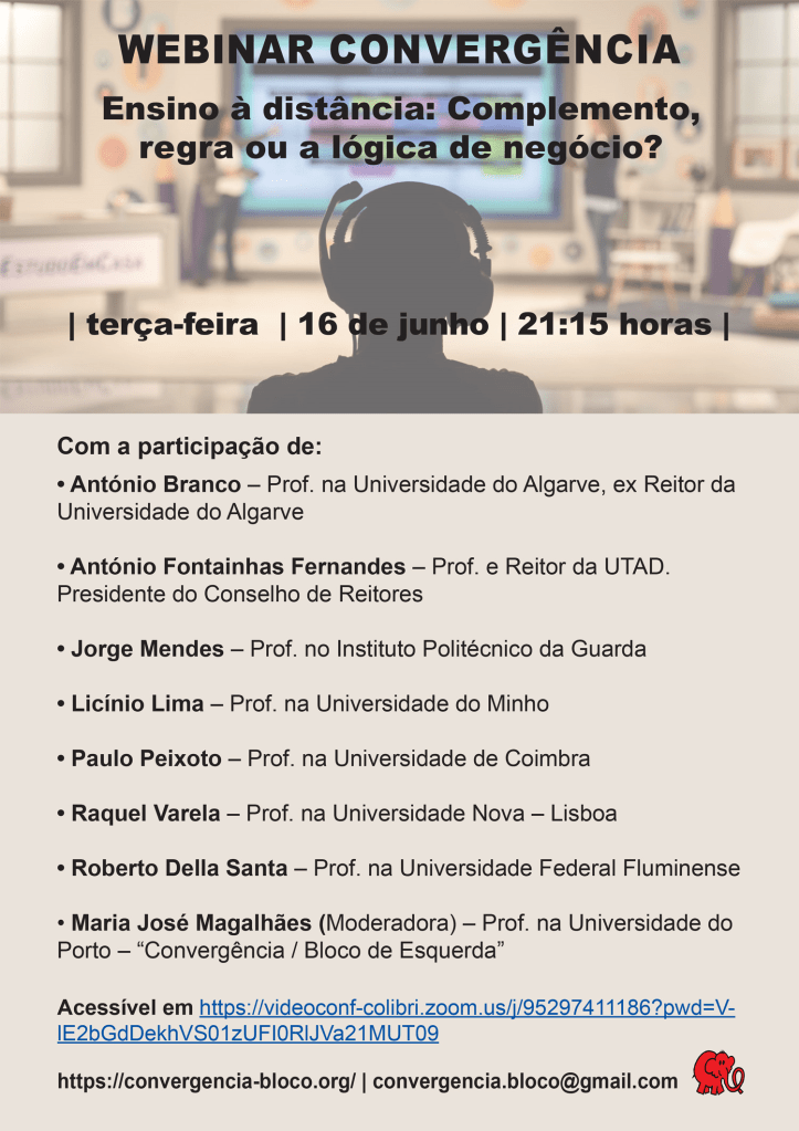Webinar com: António Branco, U. Algarve, António Fontaínhas Fernandes, UTAD, Jorge Mendes, IP Guarda, Licínio Lima, U. Minho, Paulo Peixoto, U. Coimbra, Raquel Varela, U. Nova, Roberto Della Santa, UF Fluminense e UNL, Maria José Magalhães, U. Porto, como Moderadora.