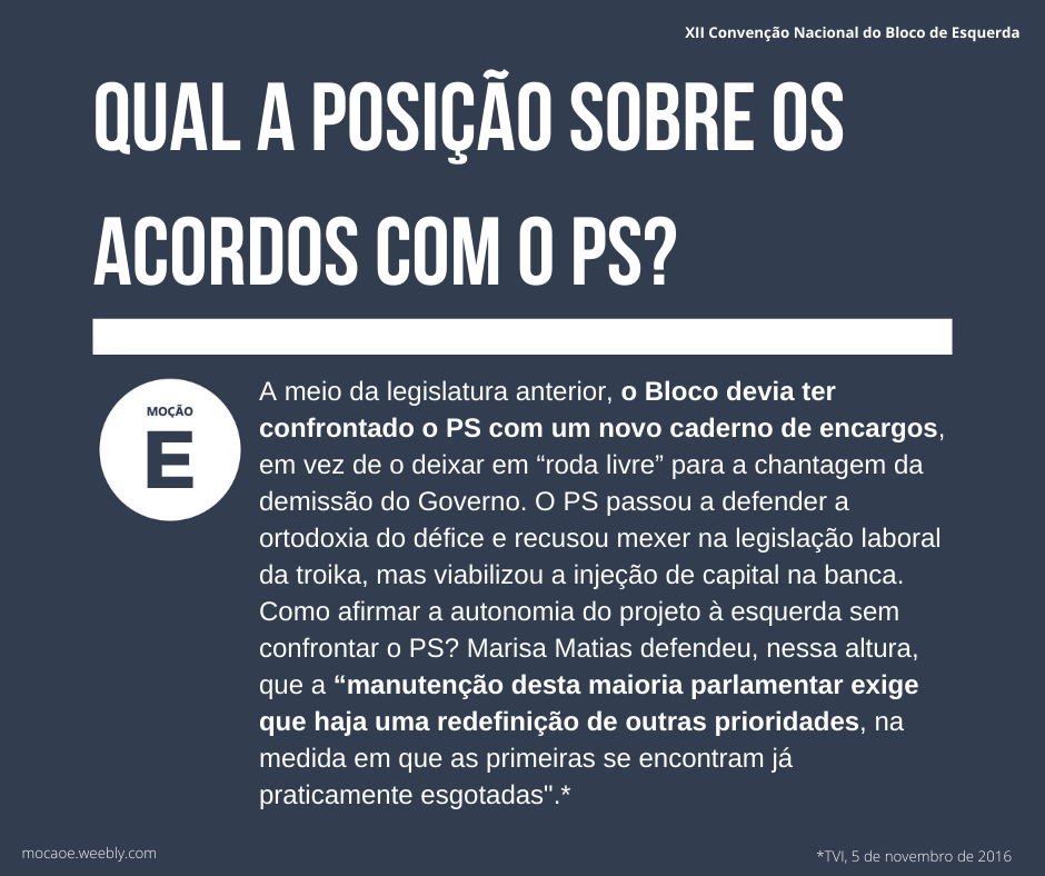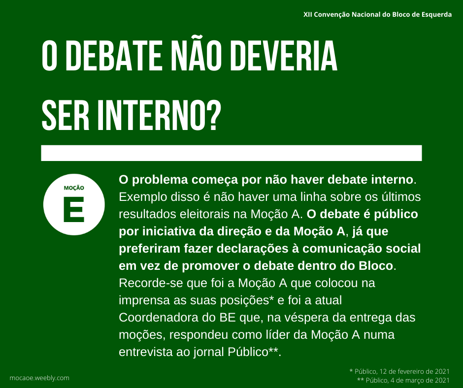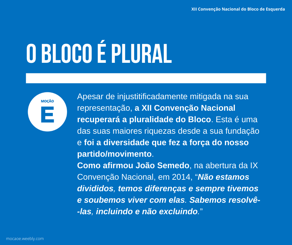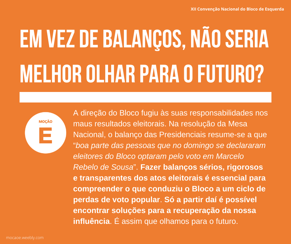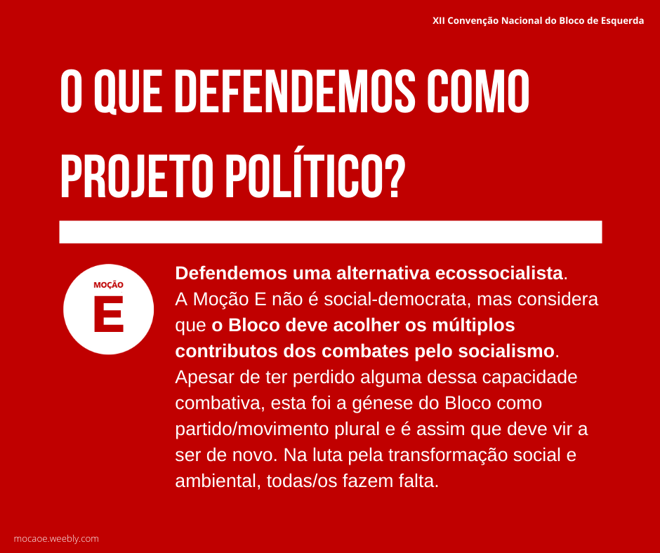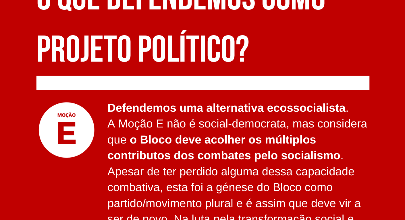 A Moção E inicia hoje um ciclo de divulgação das suas posições e proposições políticas, sob a forma de perguntas e respostas. Pegando nas perguntas mais frequentes, todos os dias será apresentada uma resposta. O objetivo é apresentar às/aos aderentes do Bloco de Esquerda o projeto que a Moção E defende, que balanços faz e que propostas apresenta para o futuro do partido-movimento. Sabe mais sobre a Moção aqui.