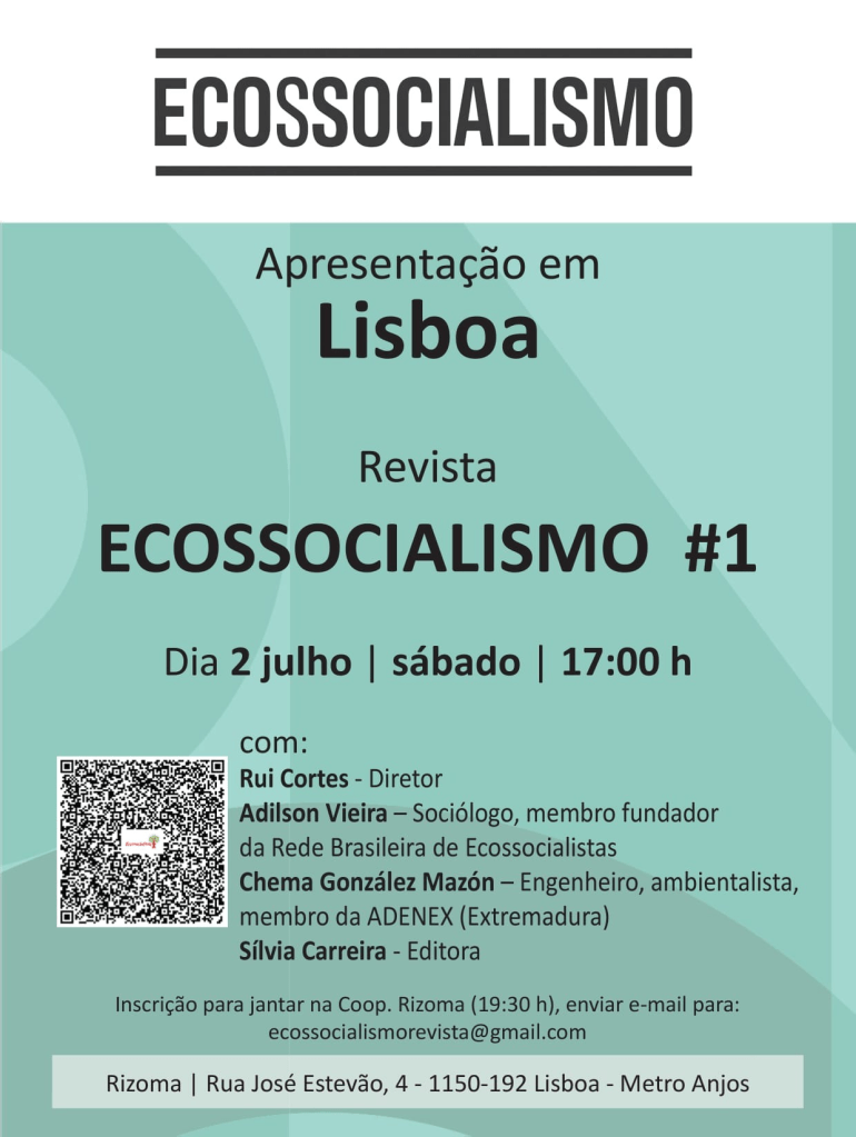 A Direção da ECOSSOCIALISMO informou que está agendada uma nova apresentação da revista no Seixal, no próximo dia 9 de julho, pelas 17 horas, no restaurante “O Bispo” (Praça da República – Seixal).