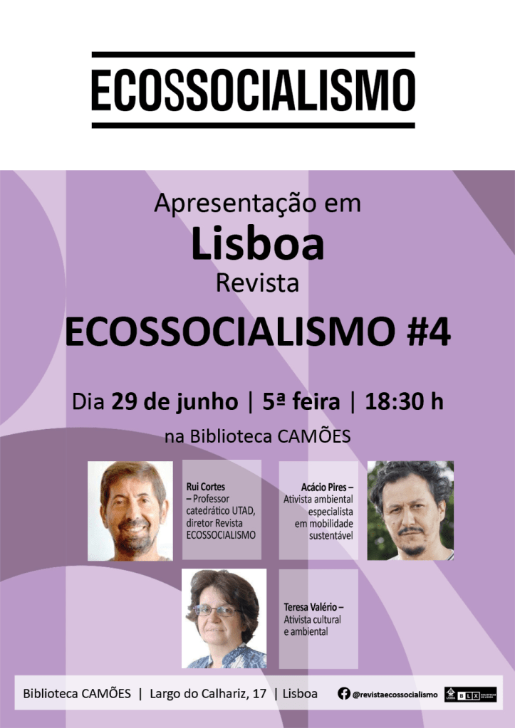 No próximo dia 29, quinta-feira, Acácio Pires, Rui Cortes e Teresa Valério apresentam o n.º 4 da revista ECOSSOCIALISMO, numa sessão que terá lugar pelas 18:30 horas, na Biblioteca Camões, em Lisboa (Largo do Calhariz – Metro Baixa-Chiado).