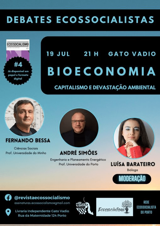 A parceria Rede Ecossocialista do Porto – Livraria “Gato Vadio” – Revista Ecossocialismo promove no próximo dia 19, quarta feira, pelas 21:00 horas um novo debate sobre BIOECONOMIA – Capitalismo e Devastação Ambiental, com a participação de Fernando Bessa Ribeiro, André Simões e a moderação de Luísa Fazendeiro, na Livraria “Gato Vadio” (Rua da Maternidade 124 Porto – entrada livre).