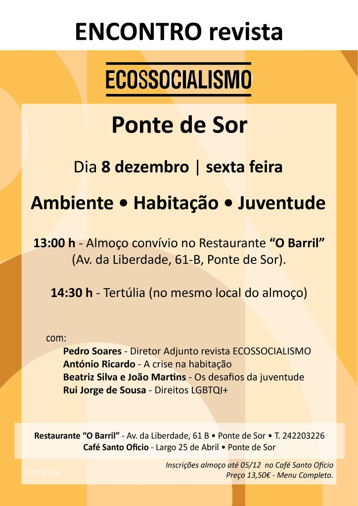 Inscrições para o almoço: em Ponte de Sor, no café Santo Ofício (Largo 25 de Abril), ou pelo e-mail ecossocialismorevista@gmail.com