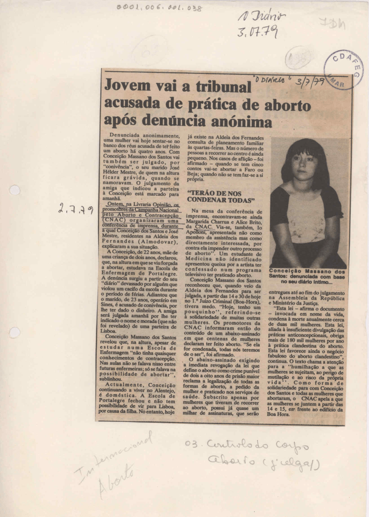 História de Conceição Massano, acusada do crime de aborto. Conferência de imprensa organizada pela CNAC em solidariedade com Massano, na qual promotores da CNAC informaram o conteúdo de um abaixo-assinado pela revogação da lei do aborto e em que centenas de mulheres afirmaram ter abortado. Nessa da conferência de imprensa, em 1979, estiveram Mariana Charrua e Alice Brito.