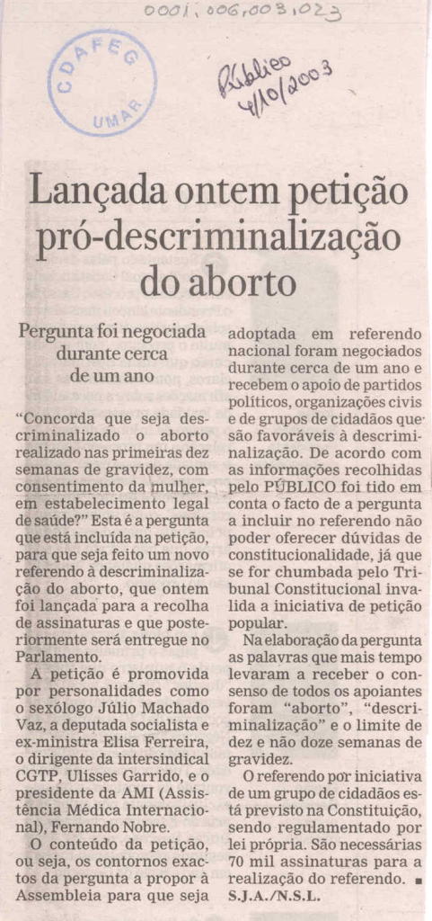 Petição promovida por um grupo de cidadãos em 2003 lança o movimento por um novo referendo à descriminalização do aborto. Em 2004, o PS, PCP e BE pediram um novo referendo, mas o PSD travou a sua realização. Só em 2006 foi convocado um novo referendo, que acabou por se realizar em Fevereiro de 2007, desta vez com o “sim” a vencer.