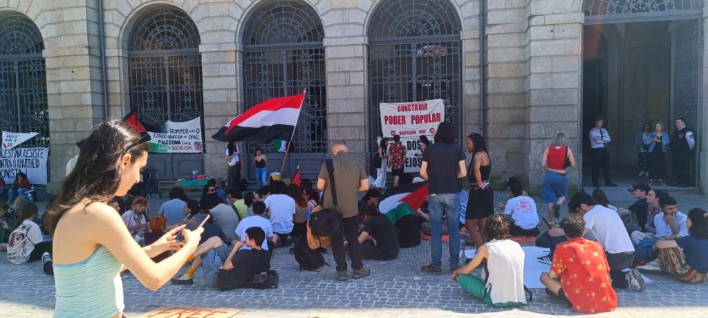 Foi participada a Assentada Estudantil e Comunitária junto à Reitoria, na Praça dos Leões, convocada hoje, dia 8, pelo grupo Estudantes do Porto em Defesa da Palestina, pelo corte imediato das relações da Universidade do Porto com Israel.