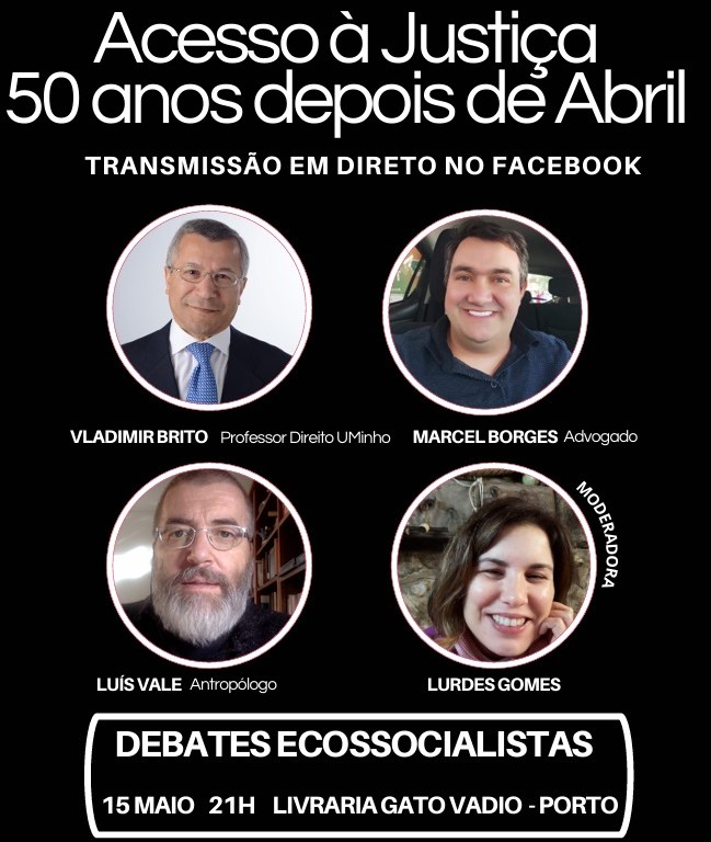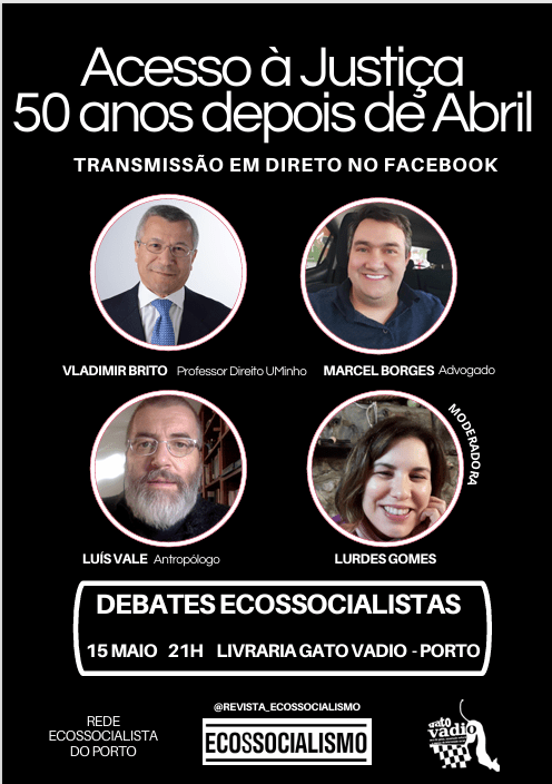 “Acesso à Justiça 50 anos depois de Abril” é um debate fundamental, promovido pela Rede Ecossocialista e pela revista Ecossocialismo, que terá lugar no Porto, dia 15 maio (4ª feira), pelas 21:00 horas, na Livraria Gato Vadio, com o professor de Direito da Universidade do Minho, Wladimir Brito, o advogado e porta voz do movimento “Estafetas em Luta” Marcel Borges, o antropólogo Luís Vale e como moderadora Lurdes Gomes.