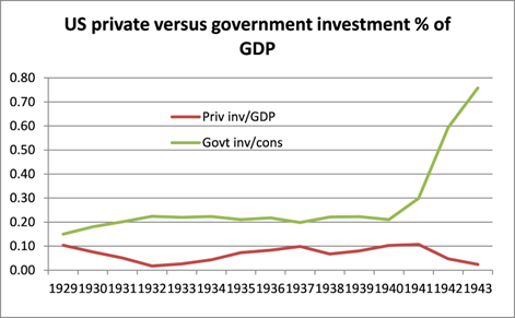 Portanto, não foi o “keynesianismo militar” que tirou a economia dos EUA da Grande Depressão – como alguns keynesianos gostam de pensar. A recuperação econômica dos EUA da Grande Depressão só começou quando a guerra mundial estava em andamento. O investimento só decolou a partir de 1941 (Pearl Harbor) em diante, atingindo, como parcela do PIB, mais que o dobro do nível em que estava em 1940. Por que isso? Não foi resultado de uma retomada do investimento do setor privado. O que aconteceu foi um enorme aumento no investimento e gastos governamentais. Em 1940, o investimento do setor privado ainda estava abaixo do nível de 1929 e na verdade caiu ainda mais durante a guerra. O setor estatal assumiu quase todo o investimento, já que os recursos (valor) foram desviados para a produção de armas e outras medidas de segurança em uma economia de guerra total.