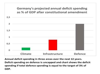 Os gastos governamentais anuais decorrentes do novo pacote fiscal alemão serão maiores do que o boom de gastos que acompanhou o Plano Marshall no pós-guerra e com a reunificação alemã no início dos anos 1990.