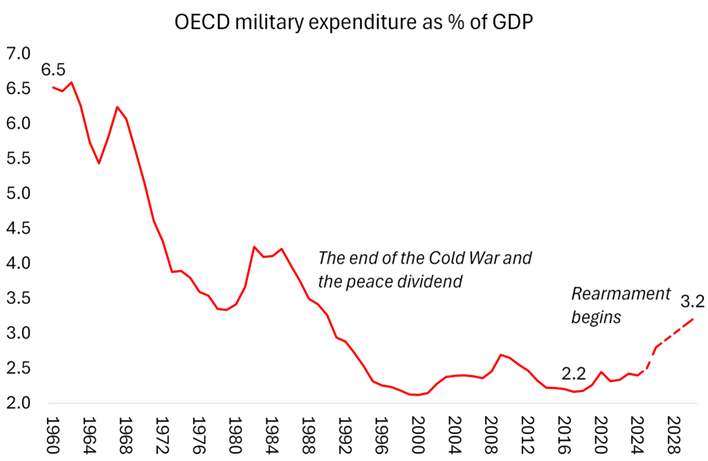 Mas não existem evidências em favor desta teoria do boom do pós-guerra. Os gastos militares do governo britânico caíram de mais de 12% do PIB em 1952 para cerca de 7% em 1960 e continuaram caindo durante os anos 1960 até atingir cerca de 5% do PIB no final da década. E ainda assim a economia britânica teve seu melhor desempenho desde então. Em todos os países capitalistas avançados, os gastos com defesa eram, no final dos anos 1960, uma fração substancialmente menor da produção total do que haviam sido no início dos anos 1950: de 10,2% do PIB em 1952-53 no auge da Guerra da Coreia; para apenas 6,5% em 1967. No entanto, o crescimento econômico foi sustentado durante os anos 1960 e início dos 1970.