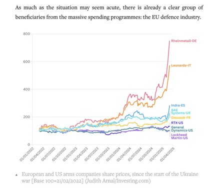 Assim, em quase toda a Europa, o apelo é por aumento nos gastos de “defesa” e rearmamento. A presidente da Comissão Europeia, Ursula von der Leyen, propôs um Plano de Rearmamento da Europa que visa mobilizar até 800 mil milhões de euros para financiar um aumento maciço nos gastos militares. “Estamos em uma era de rearmamento, e a Europa está pronta para aumentar maciçamente seus gastos com defesa, tanto para responder à urgência de curto prazo de apoiar a Ucrânia, quanto para atender à necessidade de longo prazo de assumir mais responsabilidade por nossa própria segurança europeia”, disse ela. Sob uma “cláusula de emergência”, a Comissão Europeia pedirá aumento nos gastos com armas mesmo que isso quebre as regras fiscais existentes. Fundos não utilizados da Covid (90 mil milhões) e mais empréstimos por meio de um “novo instrumento” serão usados. Von der Leyen afirmou que, se os países da UE aumentarem seus gastos militares em média 1,5% do PIB, 650 mil milhões poderão ser liberados nos próximos quatro anos. Mas não haverá financiamento extra para investimentos, projetos de infraestrutura ou serviços públicos, porque a Europa deve dedicar seus recursos para se preparar para a guerra.