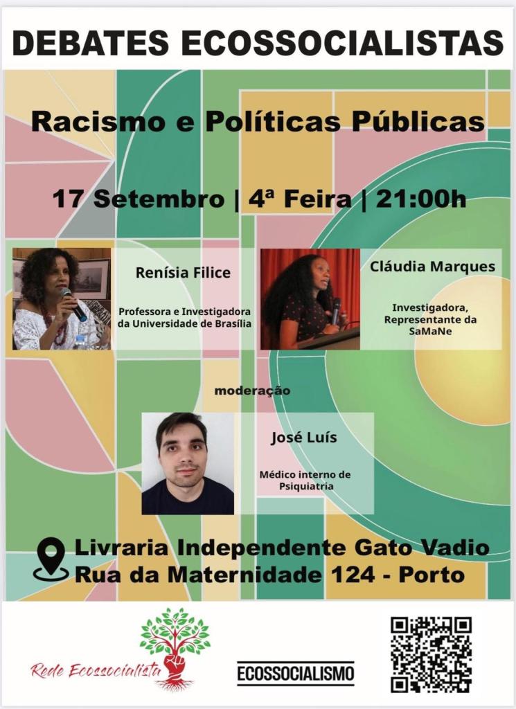 A revista ECOSSOCIALISMO e a Rede Ecossocialista do Porto promovem o debate “Racismo e Políticas Públicas” na próxima 4ª feira, dia 17, pelas 21:00 horas na Livraria “Gato Vadio”, com as intervenções iniciais de Renísia Filice, professora e investigadora da Universidade de Brasília, Cláudia Marques, investigadora e representante da SaMaNE, e a moderação de José Luís, médico psiquiatra.