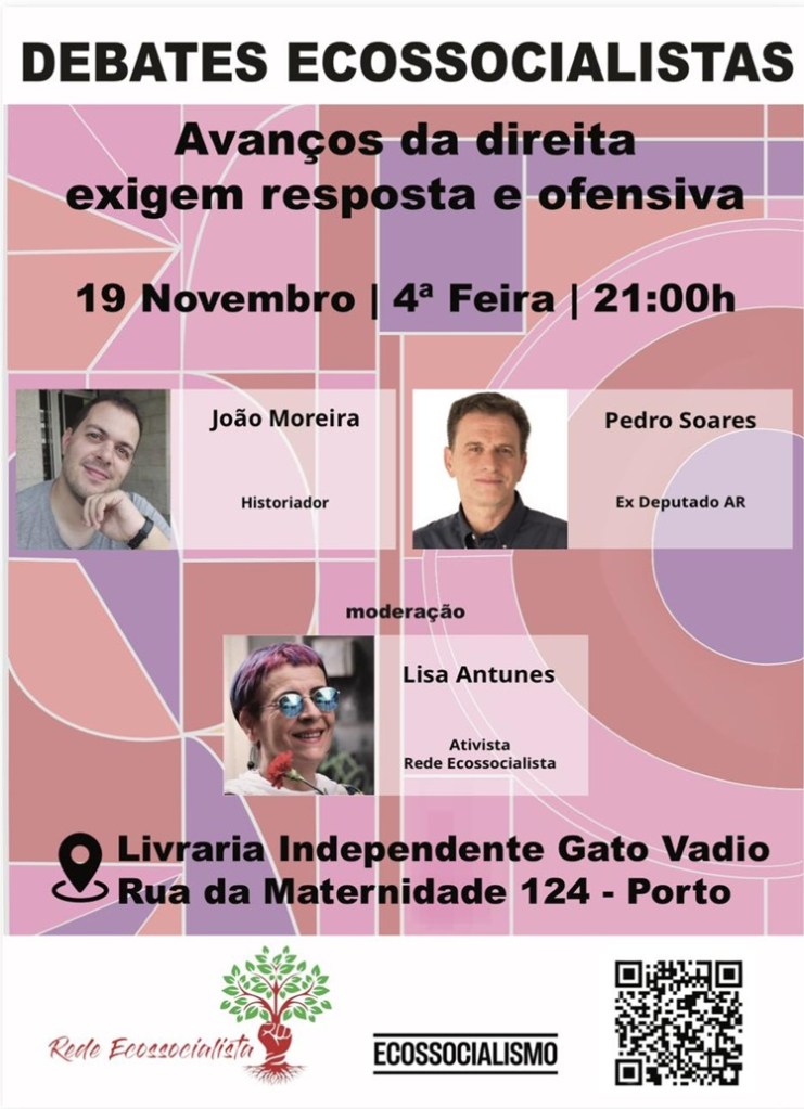 Debate com João Moreira e Pedro Soares, com moderação de Lisa Antunes, a partir do artigo “Avanços da Direita Exigem Resposta e Ofensiva”, publicado na revista ECOSSOCIALISMO #11, que aborda as consequências das recentes Legislativas e inclui o tema “A Luta pelos Direitos Humanos na Imigração”.