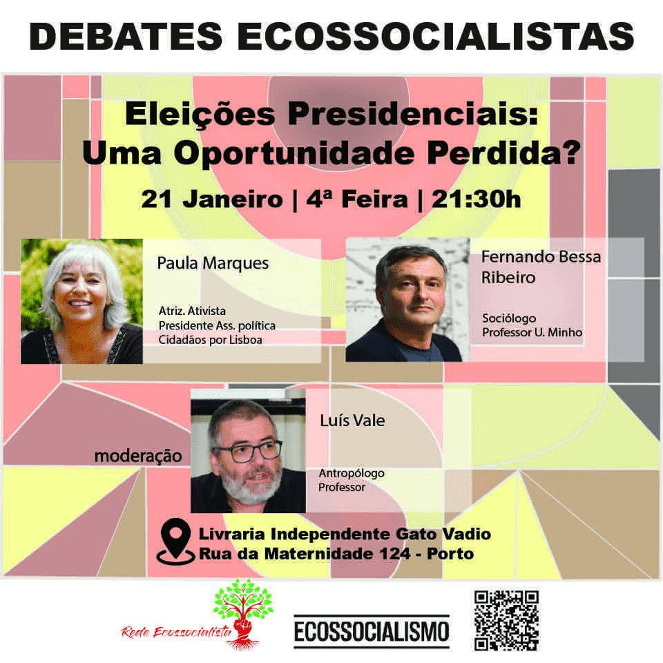 Conhecidos os resultados da 1ª volta das Presidenciais, a Rede Ecossocialista lança o debate sobre a 2ª volta, o papel das esquerdas e o espaço para uma nova resposta política. Na Livraria Gato Vadio, Porto, já no dia 21, próxima 4ª feira, pelas 21:;30 horas. Paula Marques e Fernando Bessa Ribeiro darão início ao debate, com a moderação de Luís Vale.